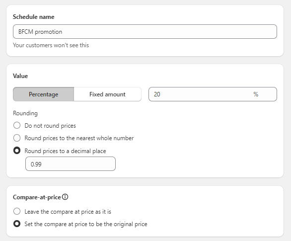 Set up one-off sales or recurring promotions with fixed amounts or percentages. You can even choose how discounted prices are rounded (e.g., to the nearest whole number or ending in .99). Automatically display original prices with a strikethrough to highlight savings.