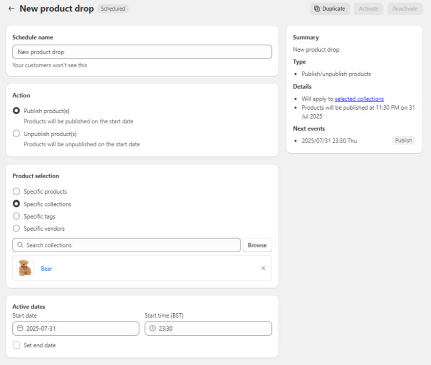 Schedule products to go live or be hidden from your online store exactly when you need them to. Perfect for new releases, limited editions, or seasonal inventory.