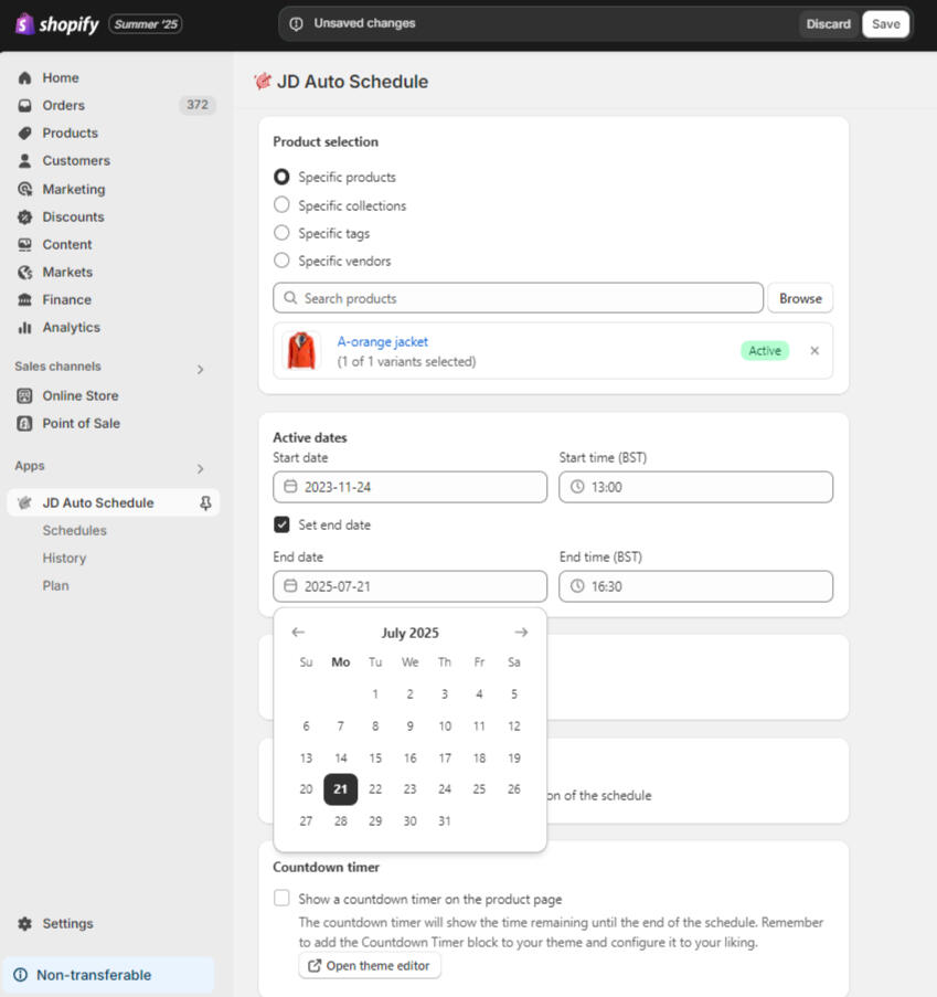 Apply schedules to your entire store, specific collections, individual products, or even products with certain tags or from particular vendors.